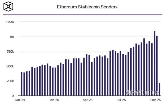 Особливо показово те, що останні два тижні активність користувачів досягла історичної позначки — понад 1 000 000 унікальних відправників стейблкоїнів на тиждень . Це означає, що за дуже короткий термін Ethereum залучив сотні тисяч нових учасників, які використовують мережу переважно для транзакцій у стейблкоїнах.