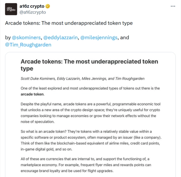 «Хоча аркадні токени підходять не для всіх випадків застосування, вони є найважливішим будівельним блоком у розвитку мереж криптовалют. Так само, як стейблкоїни відкривають нові форми торгівлі, а мережеві токени забезпечують децентралізований розподіл цінностей і управління, аркадні токени можуть стати рушійною силою масштабної цифрової економіки», – заявили дослідник a16z Скотт Дьюк Комімерс, головний технічний директор Едді Лаззарін та інші.