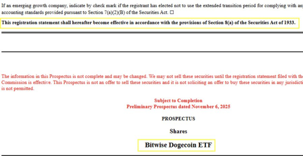 Аналітик Bloomberg ETF Ерік Балчунас заявив: “Bitwise проводить процедуру 8(a) для свого спотового ETF Dogecoin, що, по суті, означає, що вони планують набути чинності через 20 днів, якщо не буде втручання”. Це означає, що ETF Dogecoin автоматично набуде чинності після подачі документів 8-A та CERT.