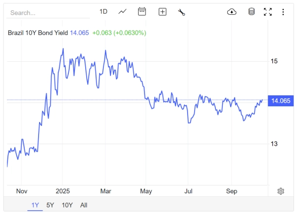 За даними TradingEconomics, прибутковість 10-річних державних облігацій Бразилії становить близько 14% після недавнього піку близько 15,2%. Це зробило Бразилію одним із найпривабливіших ринків суверенних облігацій у світі. При цьому іноземні інвестори часто стикаються з бюрократією, складними податковими правилами та труднощами під час конвертації валюти під час спроб прямих інвестицій.