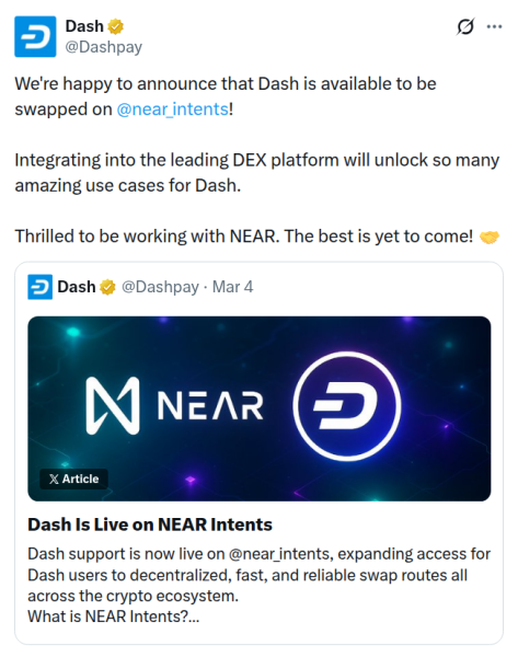 Dash доданий у NEAR Intents: кроссчейн обмін DASH з 100+ активами