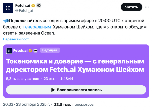 У четвер Fetch.ai заявила, що відкличе всі неврегульовані юридичні претензії до Ocean Protocol Foundation, якщо останній поверне 286 млн. токенів Fetch.ai, які, як стверджується, були продані в ході їхнього об'єднання.