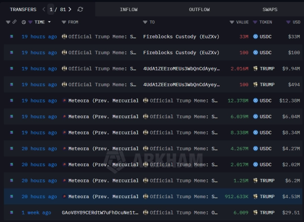 Дані платформи Arkham показують: гаманці, які асоціюються з командою Official Trump meme, у грудні вивели близько $94 млн у USDC з пулів ліквідності TRUMP і направили кошти на Coinbase.