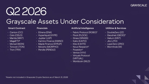 Найбільший криптоінвестор Grayscale Investments опублікував оновлений список цифрових активів, що розглядаються для майбутніх інвестиційних продуктів у другому кварталі 2026 року.