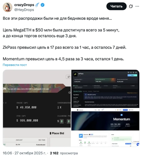 Події продажу токенів для протоколу конфіденційності zkPass, децентралізованої біржі Momentum та мережі другого рівня Ethereum MegaETH були значно перепідписані цього тижня. Приватні інвестори активно прагнуть отримати частку в криптопроектах, що розвиваються.