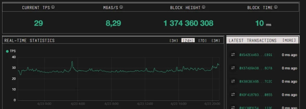 MegaETH позиціонується як «блокчейн реального часу», прагне пропускної спроможності в 100 000 TPS і практично миттєвої фіналізації транзакцій. Проте поточні середньодобові показники становлять близько 30 TPS.