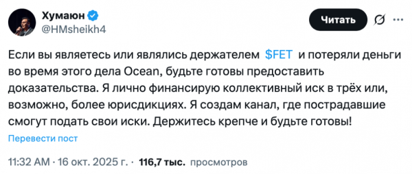 У середу Шейх заявив, що Ocean Protocol випустив та перемістив мільйони токенів OCEAN до завершення процесу злиття. За його словами, проект згодом конвертував їх у FET та переказав значні суми на централізовані біржі та маркетмейкерські компанії без належного розкриття інформації.