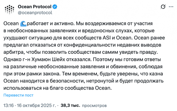 Ocean Protocol відповів у X, повністю відкинувши звинувачення і назвавши їх «необґрунтованими твердженнями та шкідливими чутками».