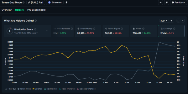 Токен управління RAIL має ринкову капіталізацію на рівні $165 млн. Аналітики платформи Nansen зафіксували важливі зміни у розподілі активу за останні 30 днів. Біржові баланси RAIL скоротилися на понад 5%, тоді як запаси на гаманцях великих власників зросли на 24%.