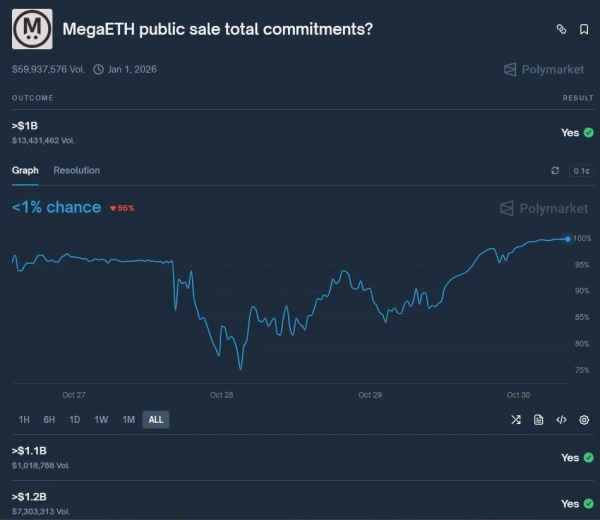Обсяг ставок на Polymarket щодо підсумків токенсейлу майже досяг $60 млн. На момент написання 99% учасників вважають, що підсумкова сума залучених коштів перевищить $1 млрд.