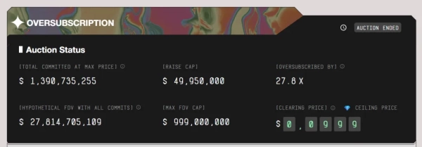 MegaETH дозволила учасникам робити ставки навіть після того, як токен виріс до максимальної клірингової ціни $0,0999. Загалом інвестори вклали понад $1,39 млрд за максимальним порогом.