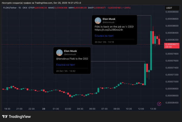 Мемкоїн Floki (FLOKI) злетів у ціні майже на 30% після згадки Ілоном Маском свого собаки породи сіба-іну на прізвисько Флокі. Різке зростання токена почалося після того, як власник Tesla і SpaceX нагадав, що його вихованець обіймає посаду генерального директора соцмережі X.