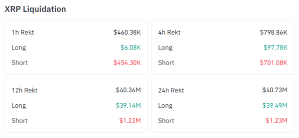 Тим часом показники за 12 годин виглядають аналогічно тому, що ринок зафіксував за останні 24 години. Зокрема, за останні 12 годин загальна сума ліквідацій XRP склала 40,36 млн доларів, з яких 39,14 млн доларів припадає на довгі позиції . Це свідчить про те, що більшість ліквідацій за 24 години відбулася протягом останніх 12 годин.