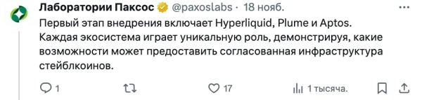 У Paxos Labs зазначили, що початковий запуск демонструє можливості підключення різних мереж до економіки стейблкоїну. Hyperliquid USDG0 підтримуватиме торгівлю з прибутковістю і нові кредитні ринки, в той час як Plume і Aptos планують використовувати його для модульних DeFi, токенізованих доходів і корпоративних платіжних систем на основі стейблкоінів.