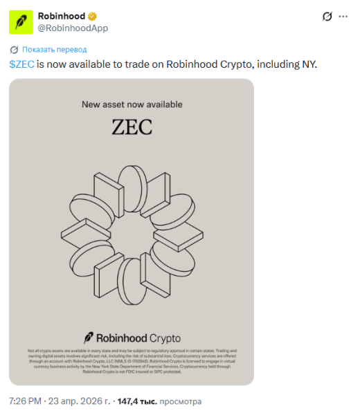 Після лістингу на Robinhood ціна криптовалюти Zcash зросла на 45%