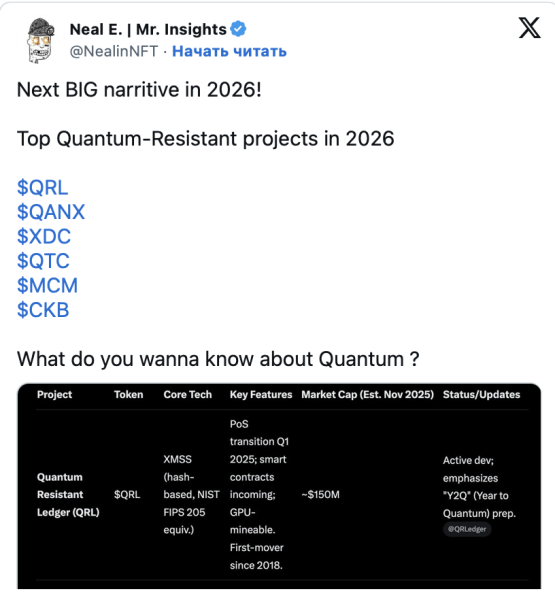 Проте грань між спекуляціями та підготовкою у криптоіндустрії розмита. Інвестори, які фокусуються на потенційних загрозах, фінансують розвиток корисних технологій. Учасники ринку вже називають квантову стійкість ймовірним «великим наративом 2026 року». Серед потенційних бенефіціарів згадуються QRL, QANX, XDC, QTC, MCM та CKB.