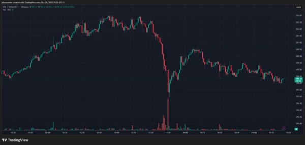Курс SOL майже не відреагував на новину На момент написання монета торгується трохи нижче за $200, за добу втративши 1,2%.