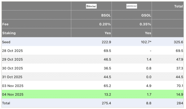 Solana-ETF продовжують залучати капітал шостий день поспіль, тоді як з біткоін та Ethereum-ETF інвестори виводять кошти. За даними Farside Investors, 4 листопада спотові біткоін-ETF зафіксували відтік $578 млн — найбільше одноденне зниження із середини жовтня.