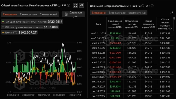 Інструменти на базі першої криптовалюти залучили $523 млн, довівши загальний чистий приплив до $60,4 млрд.