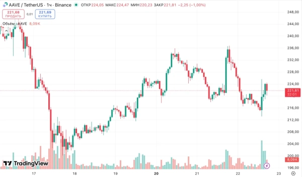 На момент написання AAVE торгується $221. За останню добу ціна монети знизилася на 1,8%.