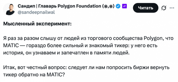 Співзасновник проекту Polygon Сандіп Нейлвал ініціював публічне обговорення брендингу токена. Він спитав співтовариство, чи варто повернути тикер MATIC замість поточного POL.