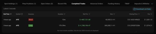 Послідовність подій така: 0x0b8a продав ефіріум на суму $174,000 на децентралізованій біржі (DEX) Hyperliquid, а потім відкрив довгу позицію з 5-кратним кредитним плечем на 9,19 мільйонів токенів APE. Незабаром після цього Apecoin виріс більш ніж на 80%, і гаманець закрив довгу позицію на піку, отримавши прибуток у розмірі $1,79 млн.