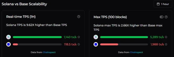 “Народна криптовалюта” значно випереджає Base за ключовими параметрами масштабованості. Поточна пропускна спроможність «народної криптовалюти» становить 1140 транзакцій в секунду (TPS — це майже в 10 разів більше показника Base (118,5 TPS). Історичний максимум Solana досяг 5289 TPS проти 1988 TPS у конкурента. При цьому теоретична межа Solana становить 650 L2-мережі.