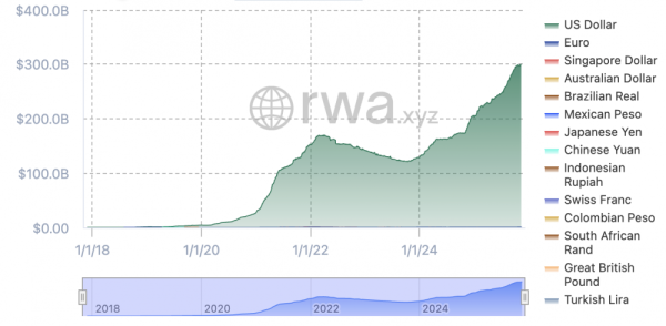 На частку стейблкоїнів, номінованих у доларах, припадає близько 299,4 млрд. доларів із загальної капіталізації ринку стейблкоїнів, що становить майже 300 млрд. доларів. Джерело: RWA.XYZ.