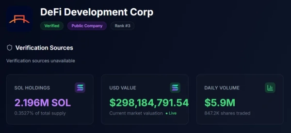 На балансі DFDV знаходиться 2,19 млн. SOL (~$298 млн.).