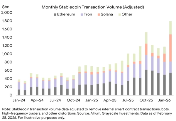 Вибір мережі «народної криптовалюти» для інтеграції обґрунтований ринковими тенденціями. За даними Grayscale, у лютому сегмент стейблкоїнів на Solana показав рекордне зростання.