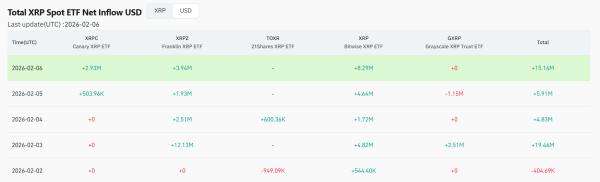 Незважаючи на це, минулого тижня протягом дня у ETF на $XRP спостерігався приплив капіталу чотири рази з п'яти. Примітно, що єдиний відтік становив 404 000 доларів 2 лютого. Протягом тижня приплив капіталу в ці продукти був значним, включаючи 19,46 млн. доларів 3 лютого , 4,83 млн. доларів 4 лютого і навіть 5,91 млн. доларів 5 лютого , в день обвалу ціни $ XRP на 19%. 6 лютого приплив капіталу в ці продукти склав 15,16 млн. доларів.