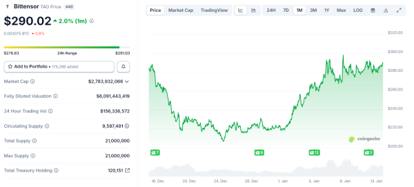 Динаміка ціни Bittensor ( TAO ) за останній місяць. Джерело: CoinGecko