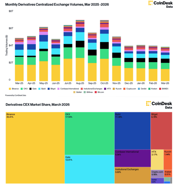 Ще одним важливим трендом стало зближення крипторинка із традиційними фінансовими інструментами (TradFi). У березні золото вперше увійшло до топ-5 активів деривативів на CEX з обсягом $55,6 млрд.