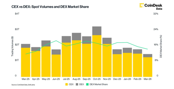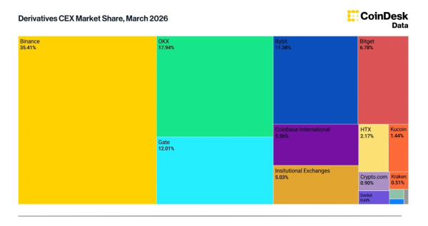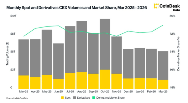 Деривативи зайняли 76,5% сукупного обороту централізованих криптобірж (CEX) у березні – це максимальний показник з вересня 2023 року. Золото вперше увійшло до п'ятірки найбільших активів за ф'ючерсним обсягом, а частка DEX у спотових торгах опустилася до мінімуму за рік. Binance утримала перші позиції щодо обсягів, частки ринку та відкритого інтересу (ОІ), випливає з березневого Exchange Review аналітичного підрозділу CoinDesk.
