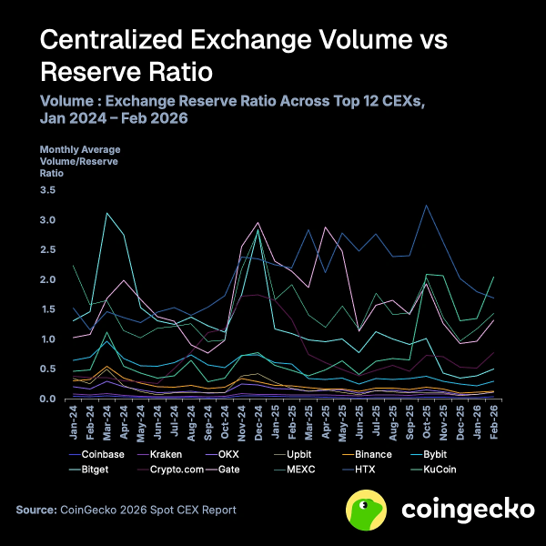 На відміну від цього, невеликі біржі демонструють значно вищу торговельну активність проти резервами. Платформи, такі як MEXC, HTX та KuCoin, показують швидкість активів у діапазоні від 1,44 до 2,04, що вказує на те, що обсяги торгівлі користувачами значно перевищують резерви бірж.