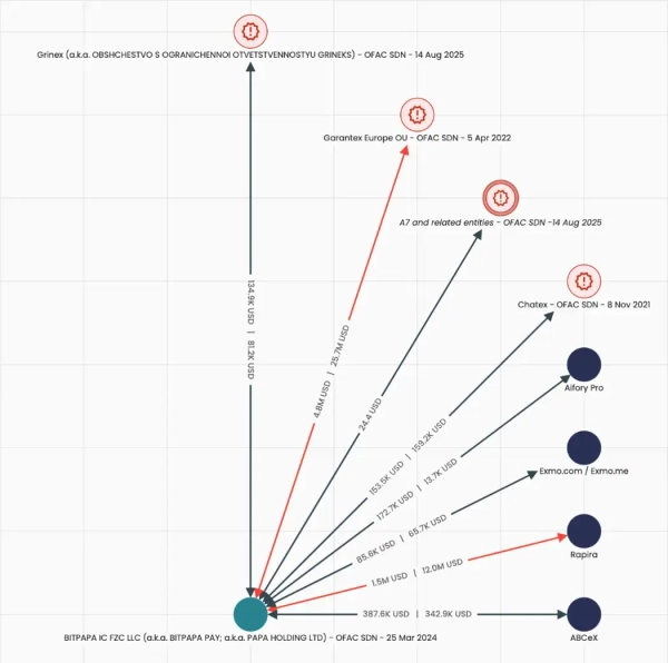 Elliptic зазначає, що близько 9,7% вихідних криптопотоків Bitpapa направляються організаціям під обмеженнями, а біржа регулярно змінює адреси гаманців.