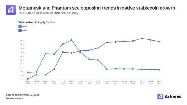 Проте успіхи проектів різняться. Обсяг випуску CASH від Phantom стабільно зростав протягом кварталу, досягнувши $100 млн до кінця року. Динаміка mUSD від MetaMask була зворотною: після жовтневого максимуму $100 млн емісія активу скоротилася вчетверо — до $25 млн.