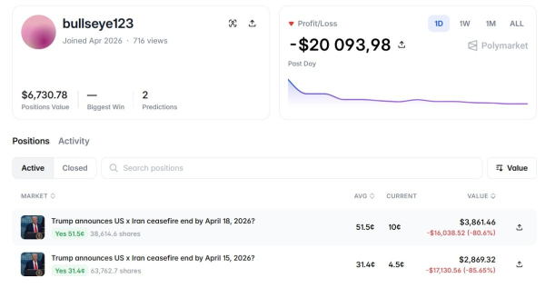У квітні людина, чия особа поки невідома, створила новий аккаунт під псевдонімом bullseye123 на Polymarket і уклала дві парі на суму $40,000 на те, що президент США Дональд Трамп оголосить про закінчення режиму припинення вогню в Ірані до 15 або 18 квітня. Імовірність цих результатів впала з моменту здійснення ставок, тому беттор зазнав нереалізованого збитку $20,094.