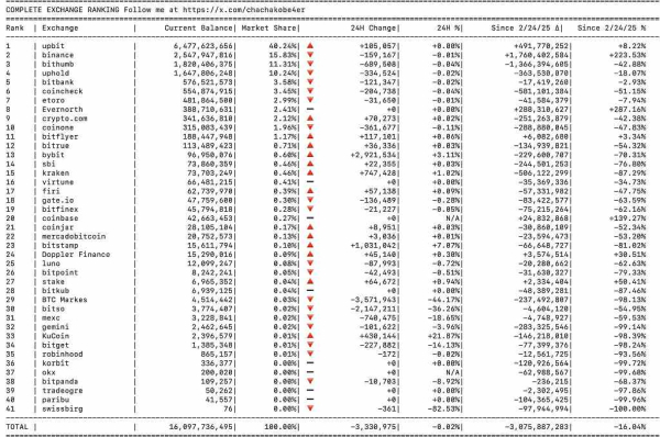 За даними користувача X @ Chachakobe4er, з 24 лютого 2025 року доступна пропозиція $XRP на 41 криптовалютній біржі скоротилася більш ніж на 3 млрд токенів, досягнувши приблизно 16 млрд. Таким чином, кількість токенів, доступних для продажу на 41 криптовалютній біржі, за цей період впала на 16%.