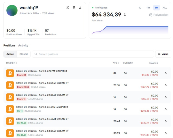 Нещодавно торговий бот, який працює під обліковим записом “woshfq19”, продемонстрував свої здібності на ринку прогнозів Polymarket. За дуже короткий період, а саме за чотири дні роботи він приніс своєму власнику $64,334.
