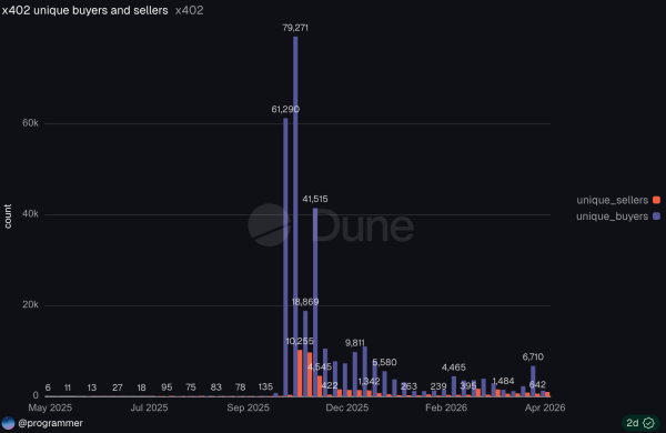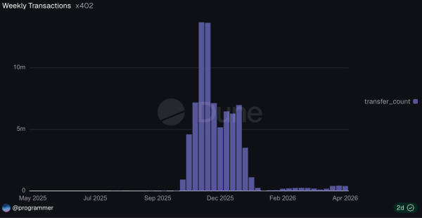 Однак порівняно з піковими значеннями минулої осені тижневий обсяг x402-транзакцій суттєво знизився.