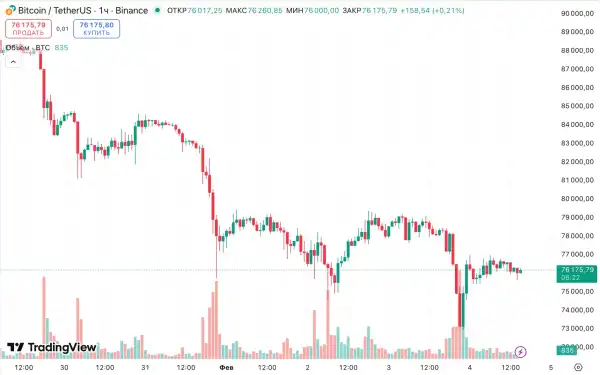 На момент написання біткоін торгується близько $76 100, трохи відновившись після просідання до $73 000.