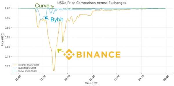 На фоні проблем у централізованих гравців децентралізовані протоколи (DeFi) показали більшу надійність. Стейблкоїн USDe від Ethena зберіг прив'язку до долара на Curve, хоча на Binance та Bybit ціна падала до $0,70.
