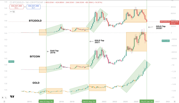 Між золотом і біткоіном із циклу в цикл простежується та сама закономірність. Поки дорогоцінний метал знаходиться у фазі основного зростання, крипторинок стоїть у консолідації. Після завершення ралі золота капітал зміщується в цифрові активи, що запускає їх бичаче ралі.