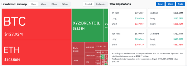 За останню годину обсяг ліквідацій на крипторинці сягнув $374 млн, а за добу перевищив $782 млн.