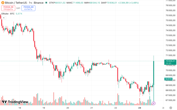 Курс першої криптовалюти підскочив на 3,4% і наблизився до позначки 71 000 доларів. Президент США Дональд Трамп оголосив про призупинення ударів по Ірану на п'ять днів.