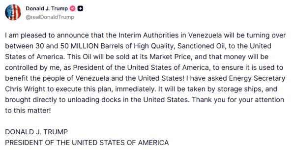 Трамп написав у Truth Social, що венесуельську нафту продадуть «за ринковою ціною». За його словами, всі кошти будуть під контролем президента Сполучених Штатів. За ціною близько $56 за барель сума угоди може сягнути $2,8 млрд.