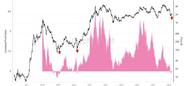 Судячи з графіка, опублікованого співробітниками дослідницької компанії CryptoQuant, власники криптогаманців, в яких зберігаються понад 100,000 ETH вартістю $211,6 млн за поточним курсом, стали підраховувати нереалізовані збитки вперше з 2020 року, коли ціна монети опустилася нижче $2. Однак завдяки недавньому закріпленню вартості активу в діапазоні вище цього значення вони знову вийшли у плюс.