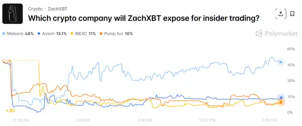 Його таємничий пост, що з'явився на тижні, спровокував хвилю ажіотажу – на Polymarket було укладено ставки більш ніж на $2 млн . Учасники сперечалися, яку компанію ZachXBT викриє. На Axiom довелося 13% ставок, що принесло добрий прибуток тим, хто зробив на неї ставку заздалегідь.