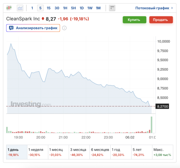 Акції CleanSpark (CLSK) втратили 19,13% під час основної торгової сесії, а після її завершення впали ще на 8,6% до $7,55. У п'ятницю, 6 лютого, на премаркеті ціна скоригувалась, але незначно — до $8,06.